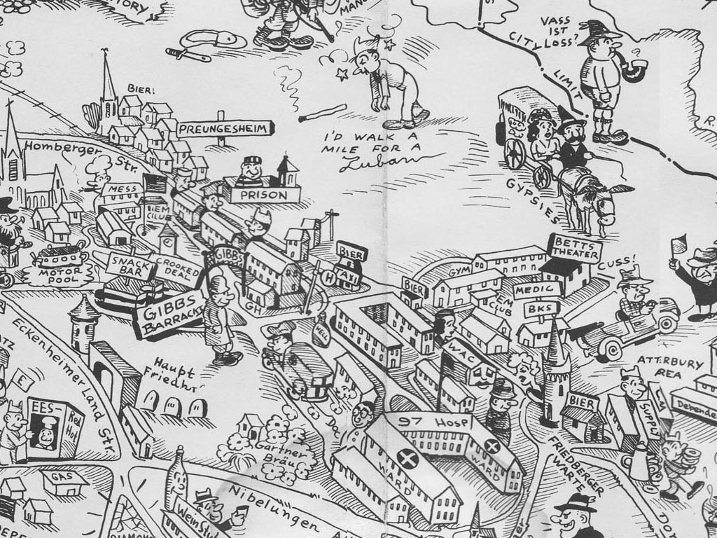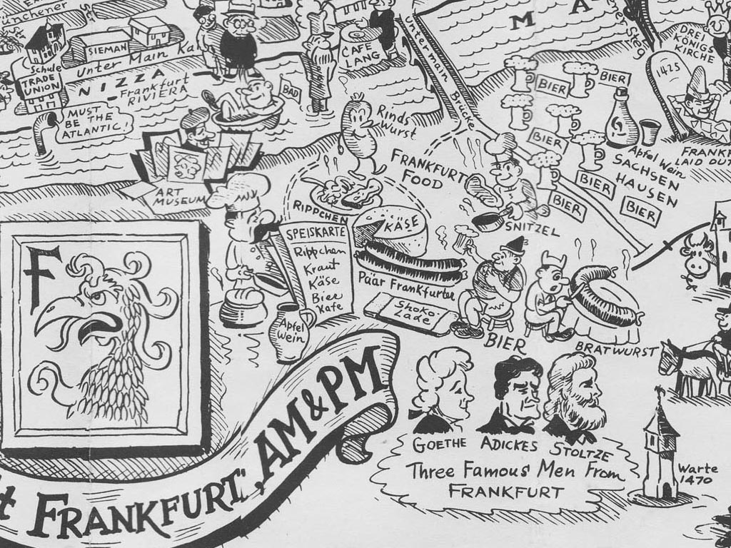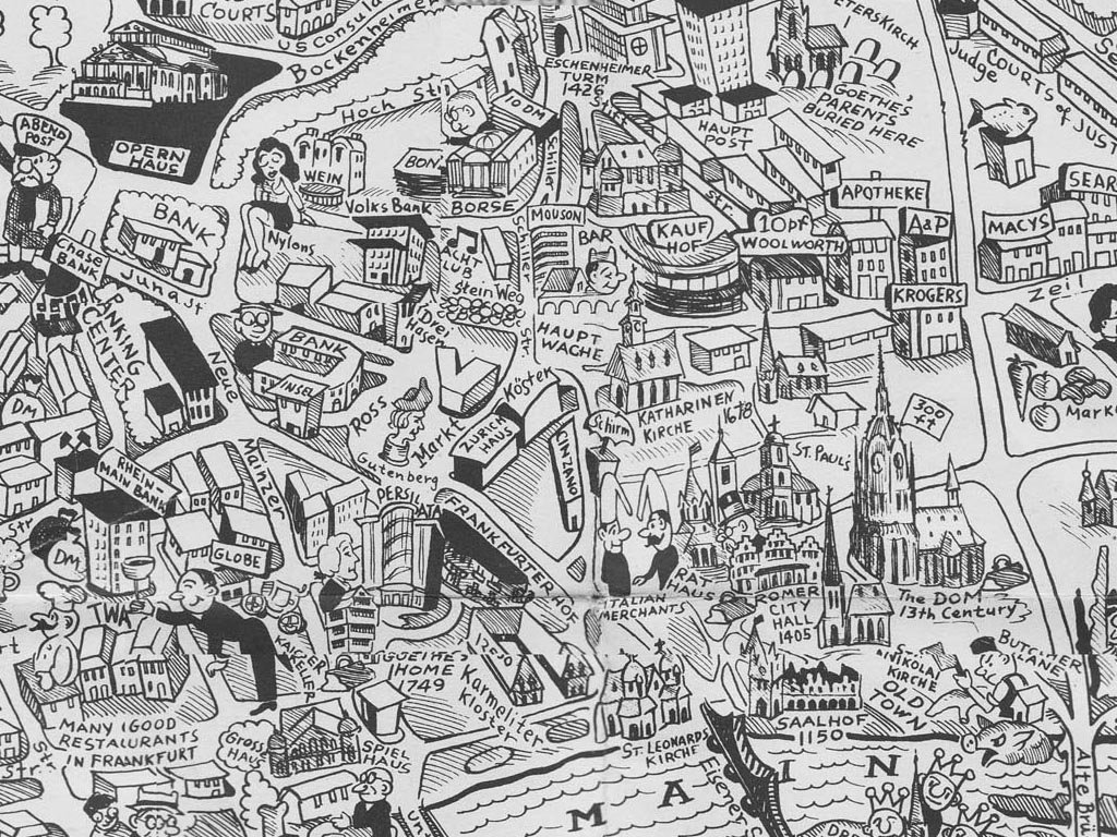 Crows' Eye View of Frankfurt AM & PM, 1954 Cartoon Map by "Lederhosen Lefty" Burgess FFM USFET Book 1946/47 TIP June 1959 TWIG April 4-10, 1965 TWIG Sept. 1-15, 1969 Frankfurt In Your Pocket, 1953 FAHS/Frankfurt Publications |