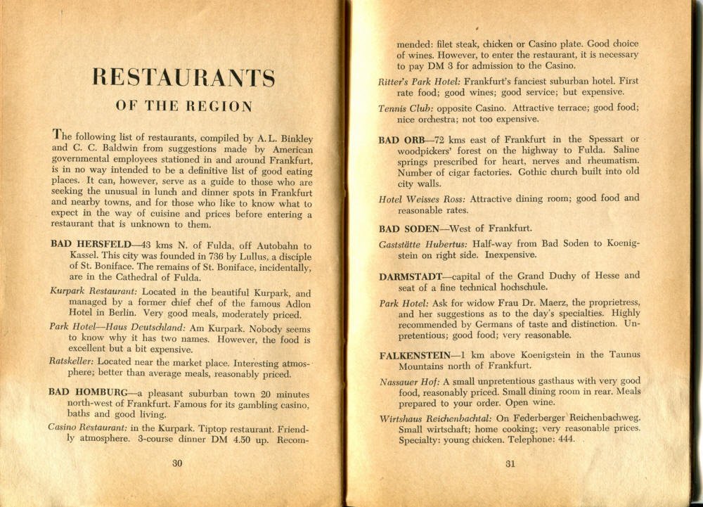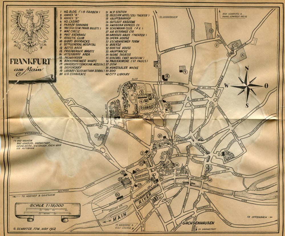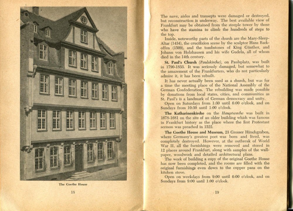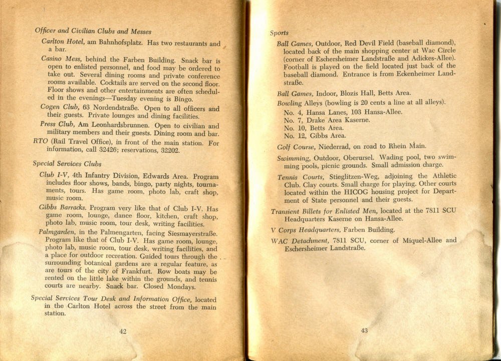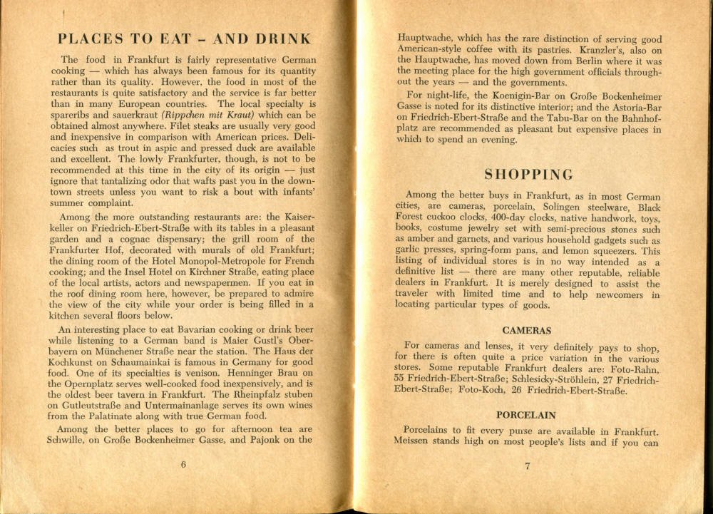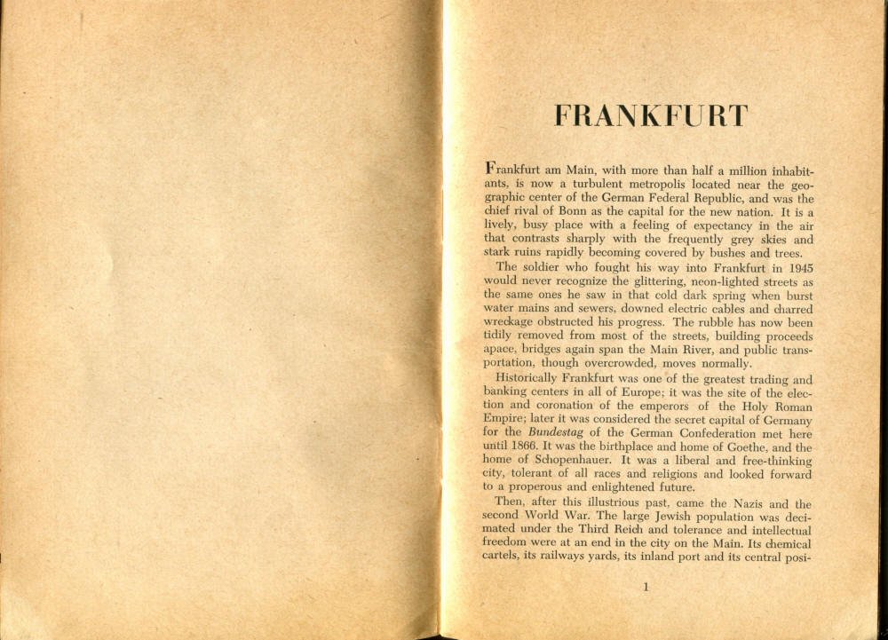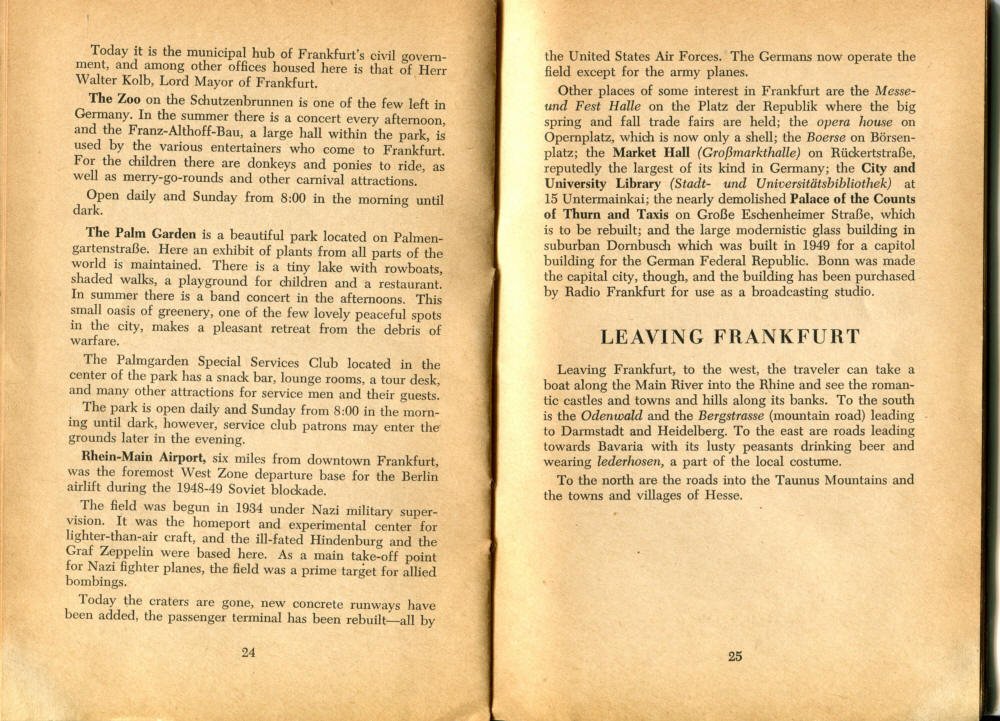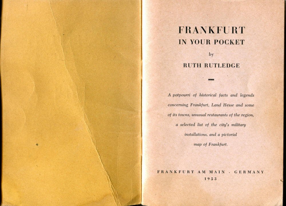 Pocket by Ruth Rutledge, 1953 A Guide to Frankfurt and Hesse for U. S. Personnel FFM USFET Book 1946/47 TIP June 1959 TWIG April 4-10, 1965 TWIG Sept. 1-15, 1969 SGT G.I. Crows' Eye View of Frankfurt AM & PM, 1954 FAHS/Frankfurt Publications