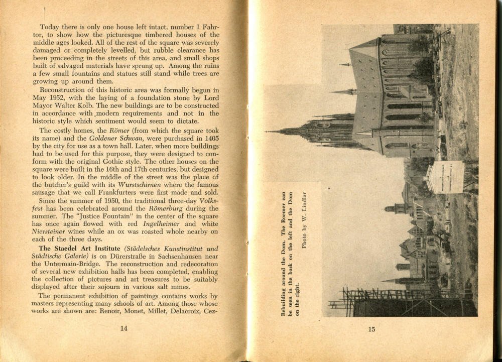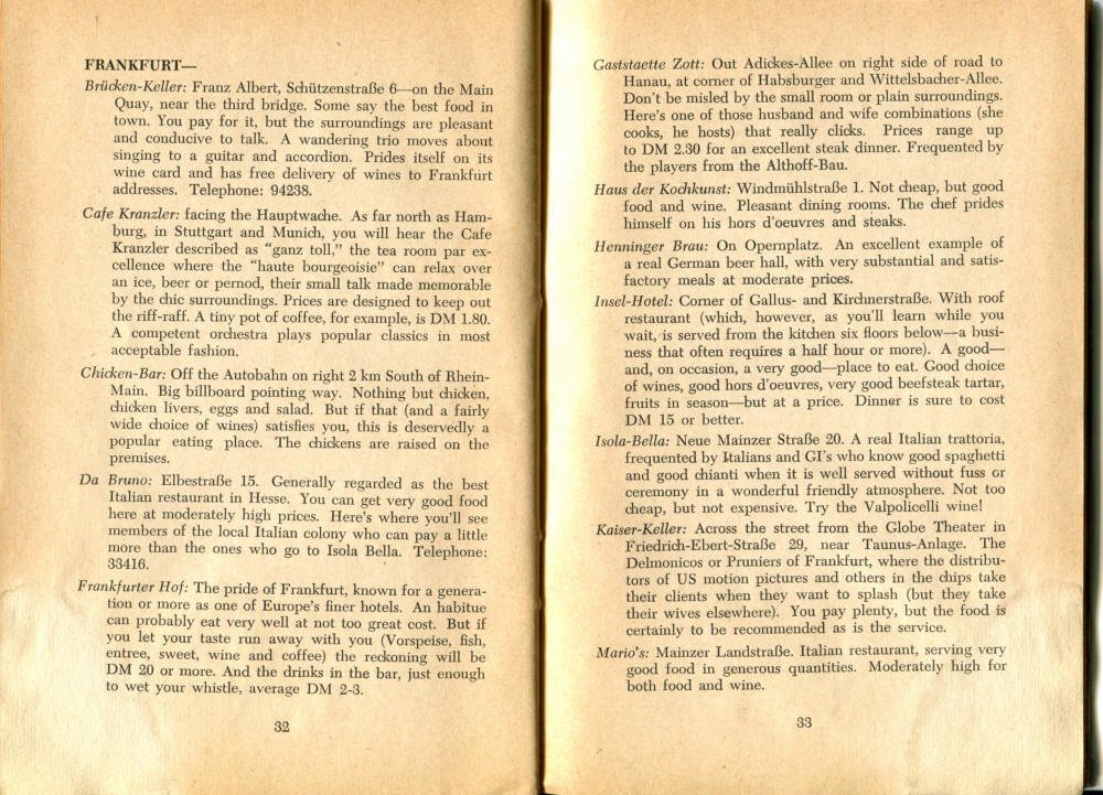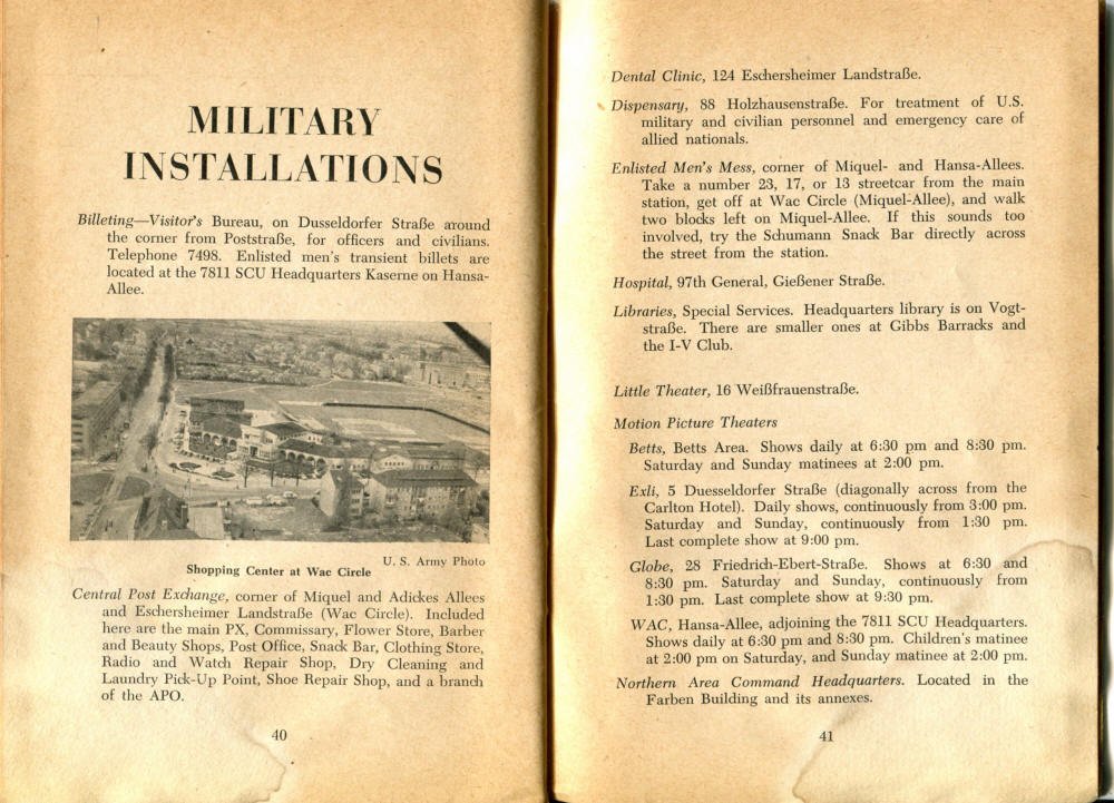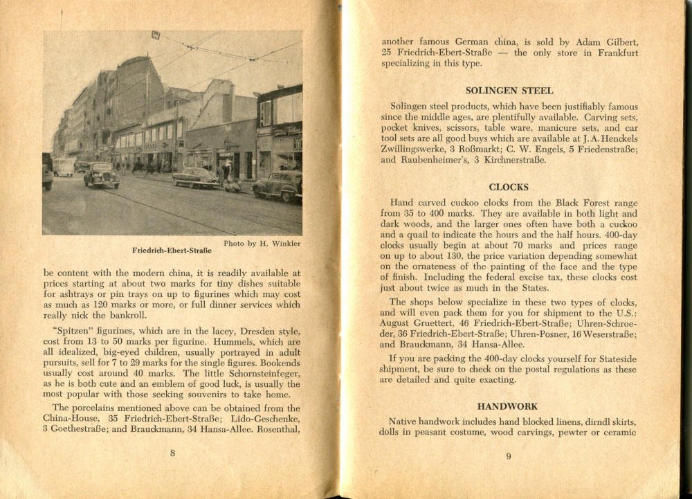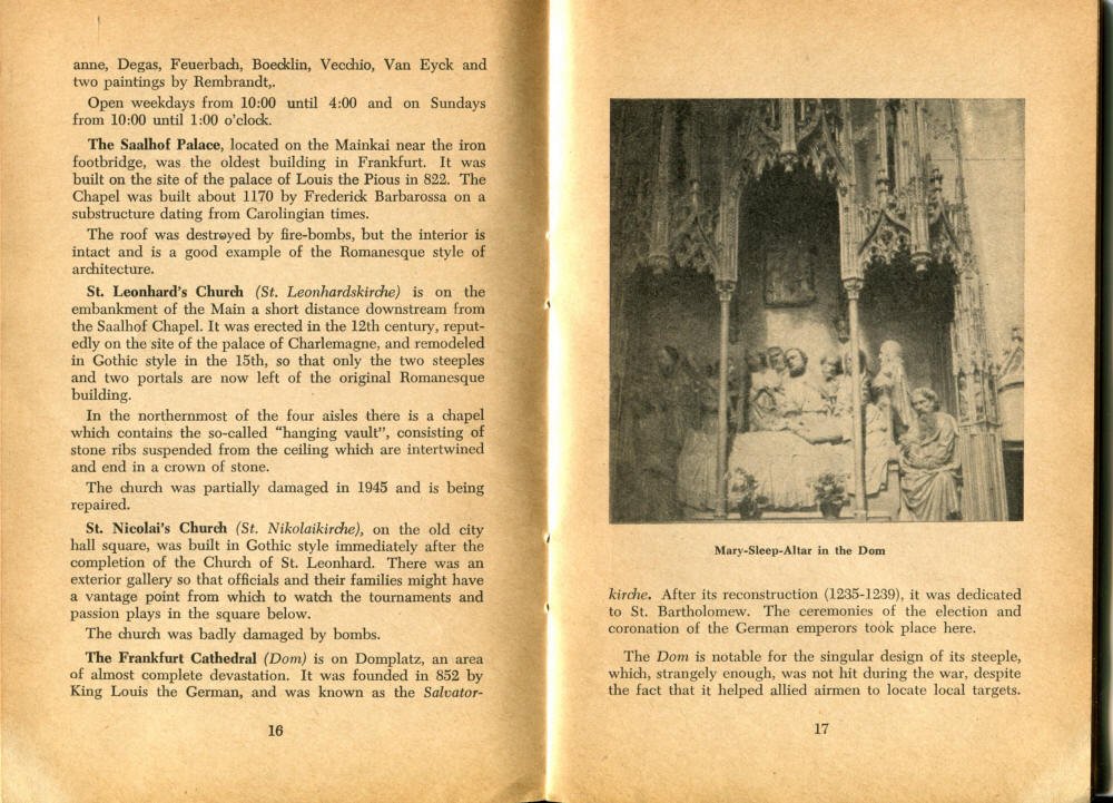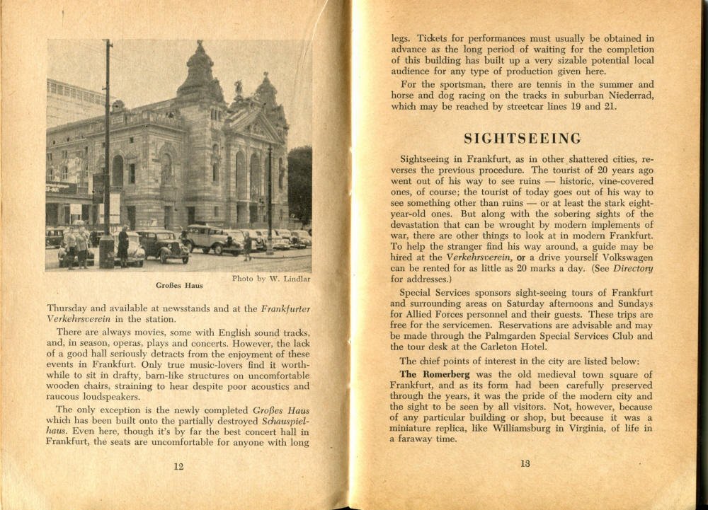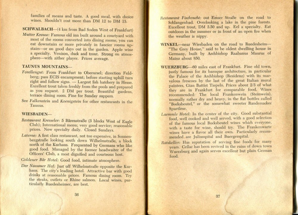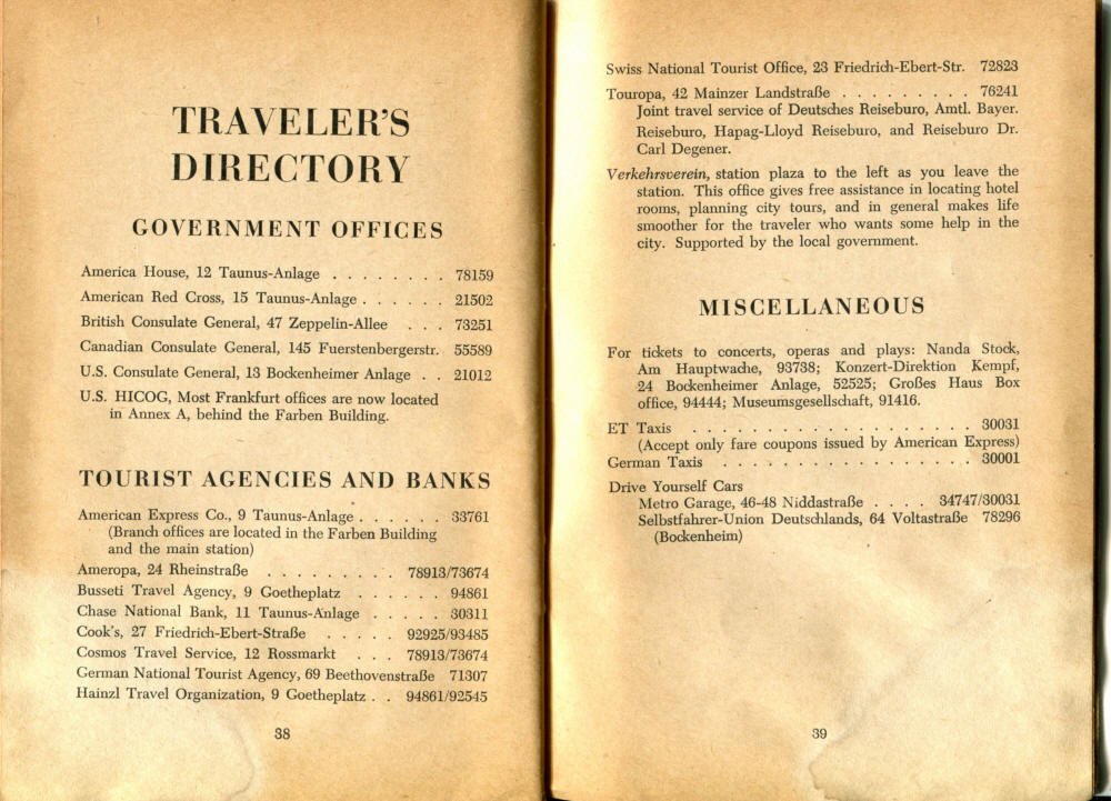 Pocket by Ruth Rutledge, 1953 A Guide to Frankfurt and Hesse for U. S. Personnel FFM USFET Book 1946/47 TIP June 1959 TWIG April 4-10, 1965 TWIG Sept. 1-15, 1969 SGT G.I. Crows' Eye View of Frankfurt AM & PM, 1954 FAHS/Frankfurt Publications