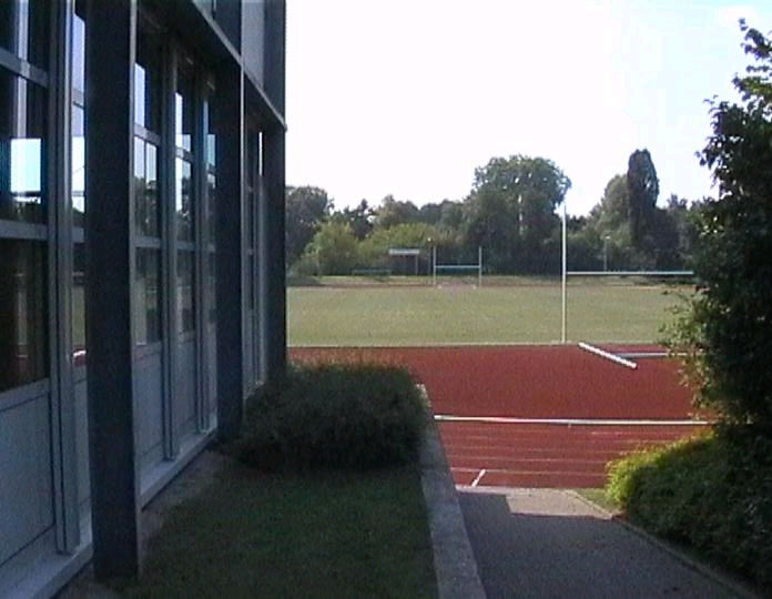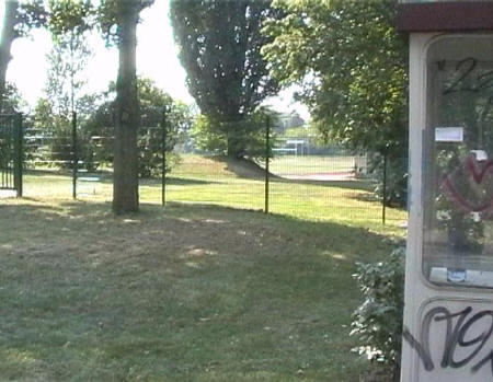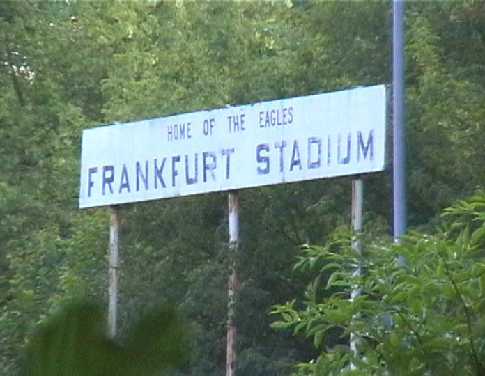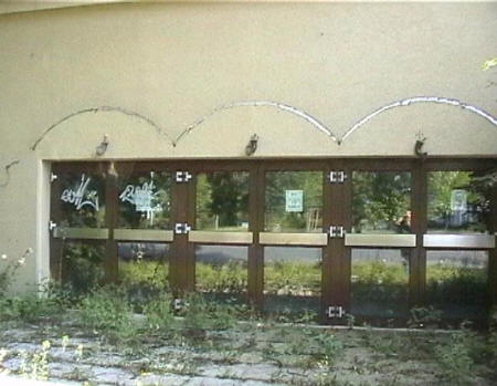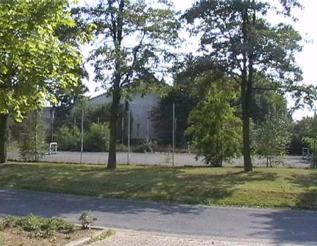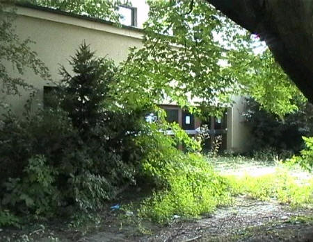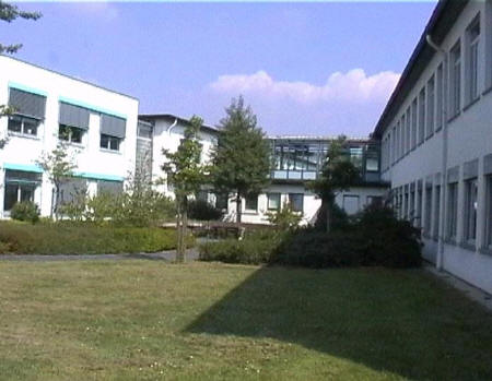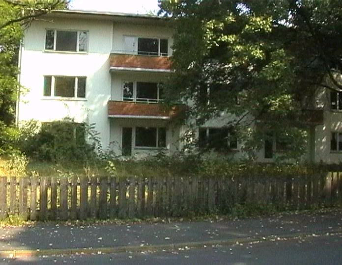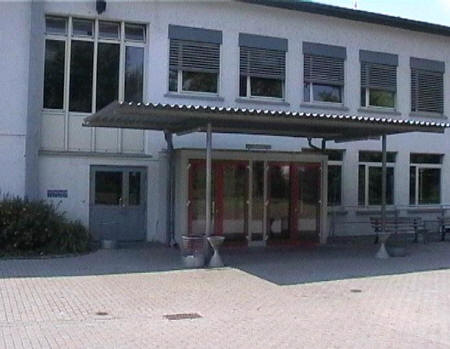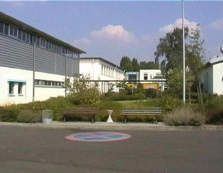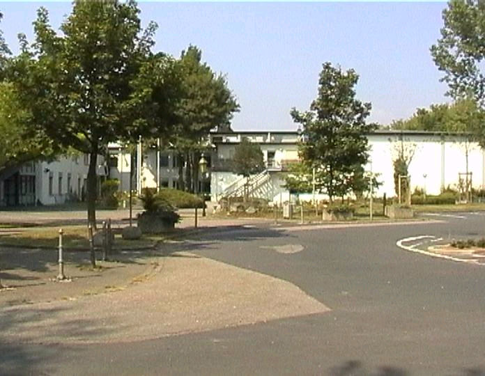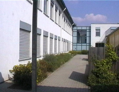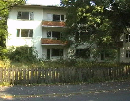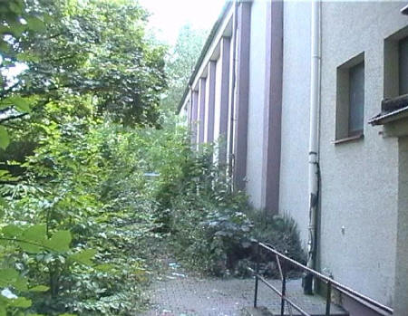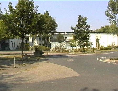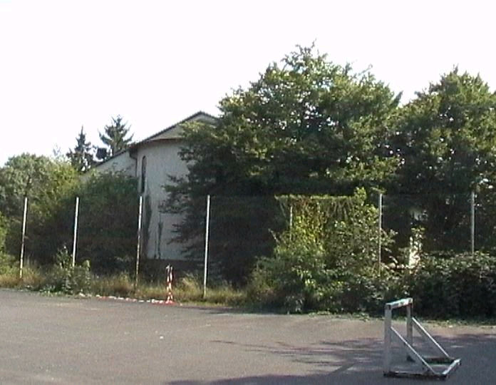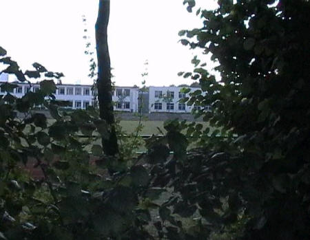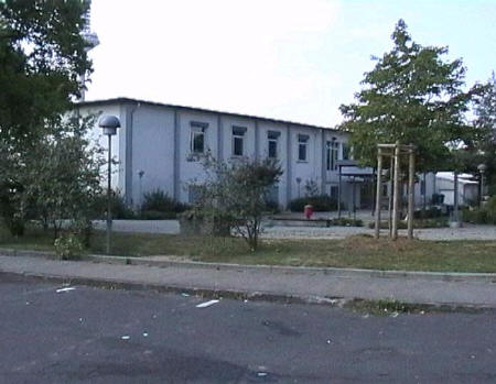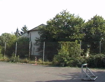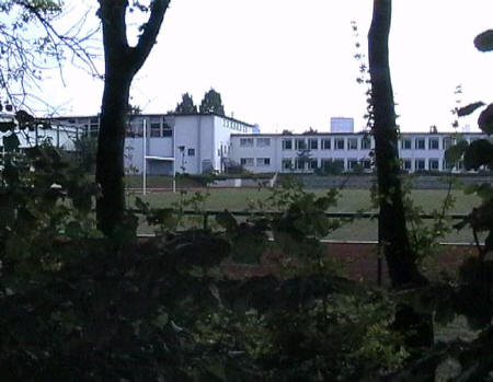 list when he posted the pictures: I want to share these pictures of the High School with all of you. On the Saturday of Aug. 25 I went down to the High School after over 30 years. It was hard to recognize the old school since it has been redone. It is now a German school where the EAGLE still files on the entrance and in the stadium. Across from the High School is the IDLE HOUR and the church which are in a jungle of trees and shrubs. It was very sad for me to see all of this. The IG FARBEN Building is being prepared for the University of Frankfurt. Anything between the school and the IG Farben is "no mans land" and is fenced in. The houses across the street are partially inhabited by Germans the rest of the houses are empty. The PX has been torn down, a German Polizei Station is there now. In fact all of Frankfurt has lost it's American bases and housing areas. Hanau still has a high school and all of the housing areas are still in use. |