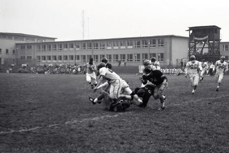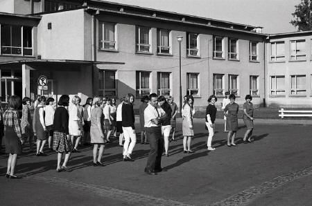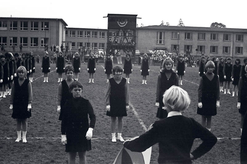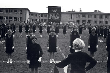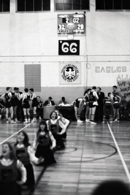 | It's a little too far away, but... The blond girl, center left with her hair flying is probably Linda Reese. Girl in plaid dress (center) is likely Melinda Holm. Guy in the very center, wearing a tie, is probably Steve Smith. Dark hair, plaid shirt behind BB net is Greg Eaves...Also, there are a lot of German students in this photo. - Mary I. Greg Zunich, Greg Eaves, Pete Witt, Tom Pagett, Steve Jedlicki, & Chris Riche also - Stuart |
