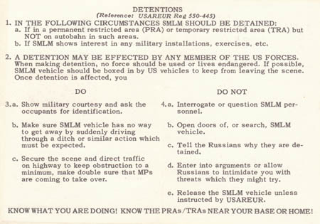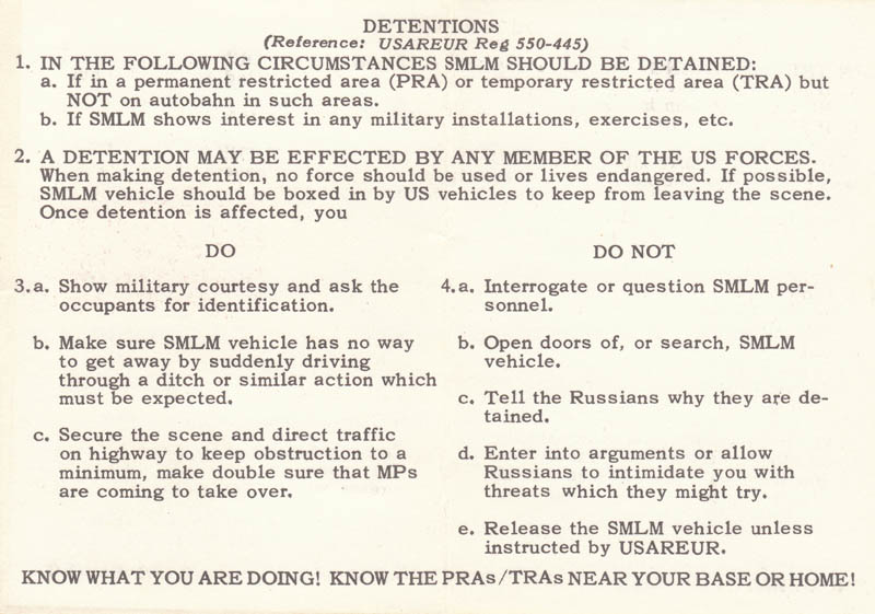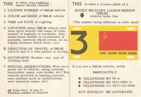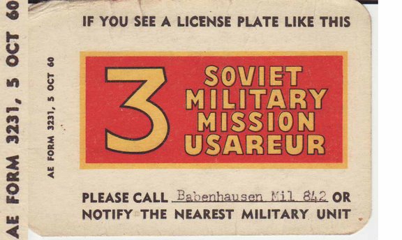 Hey Dutch et al: You're right about that...the activity would arouse some interest. Some of the Alerts were practice and others were a response to events. They would also be sitting outside the gates when the unit would pull out headed to the field for maneuvers in Wielflecken and Fulda. The Army had various units on site in both locations year round. Both locations flanked the Fulda Gap and provided a modicum of security. I heard at the time that most likely they wouldn't survive the first wave of an attack and that their job was to delay the invasion as long as they could -- pretty much a suicide mission. I believe all of the Soviet observers were in the military, some just didn't wear their uniforms in town. Cheers, Ken |
