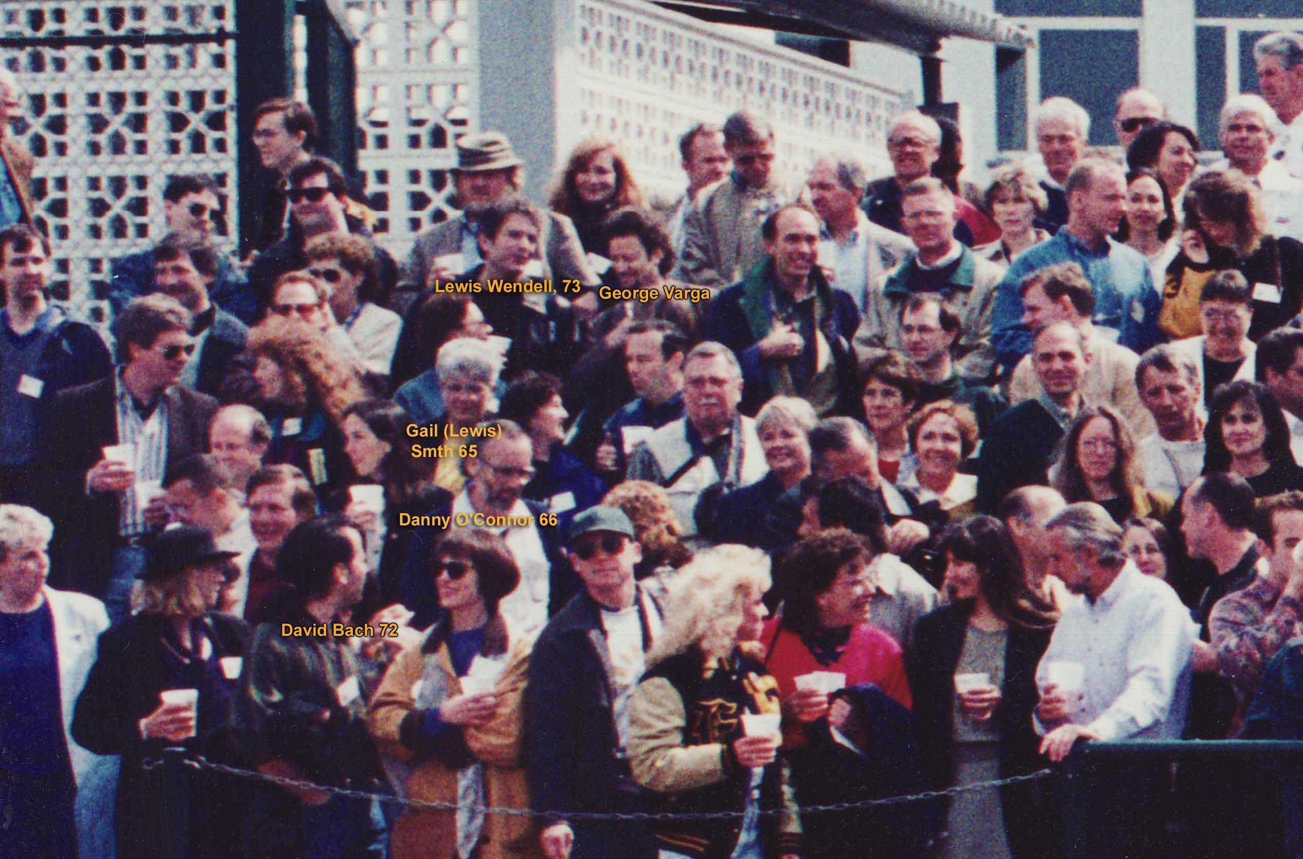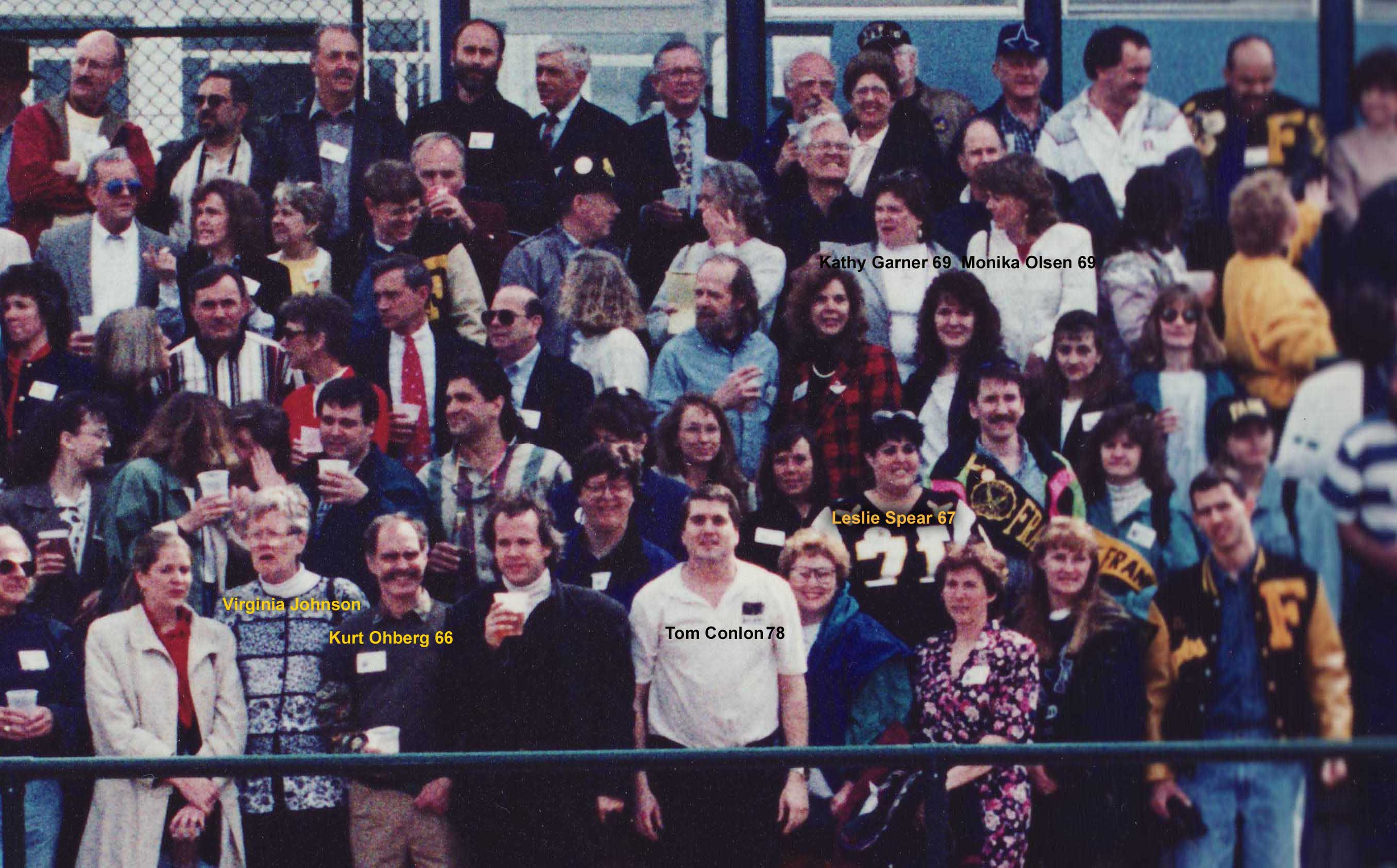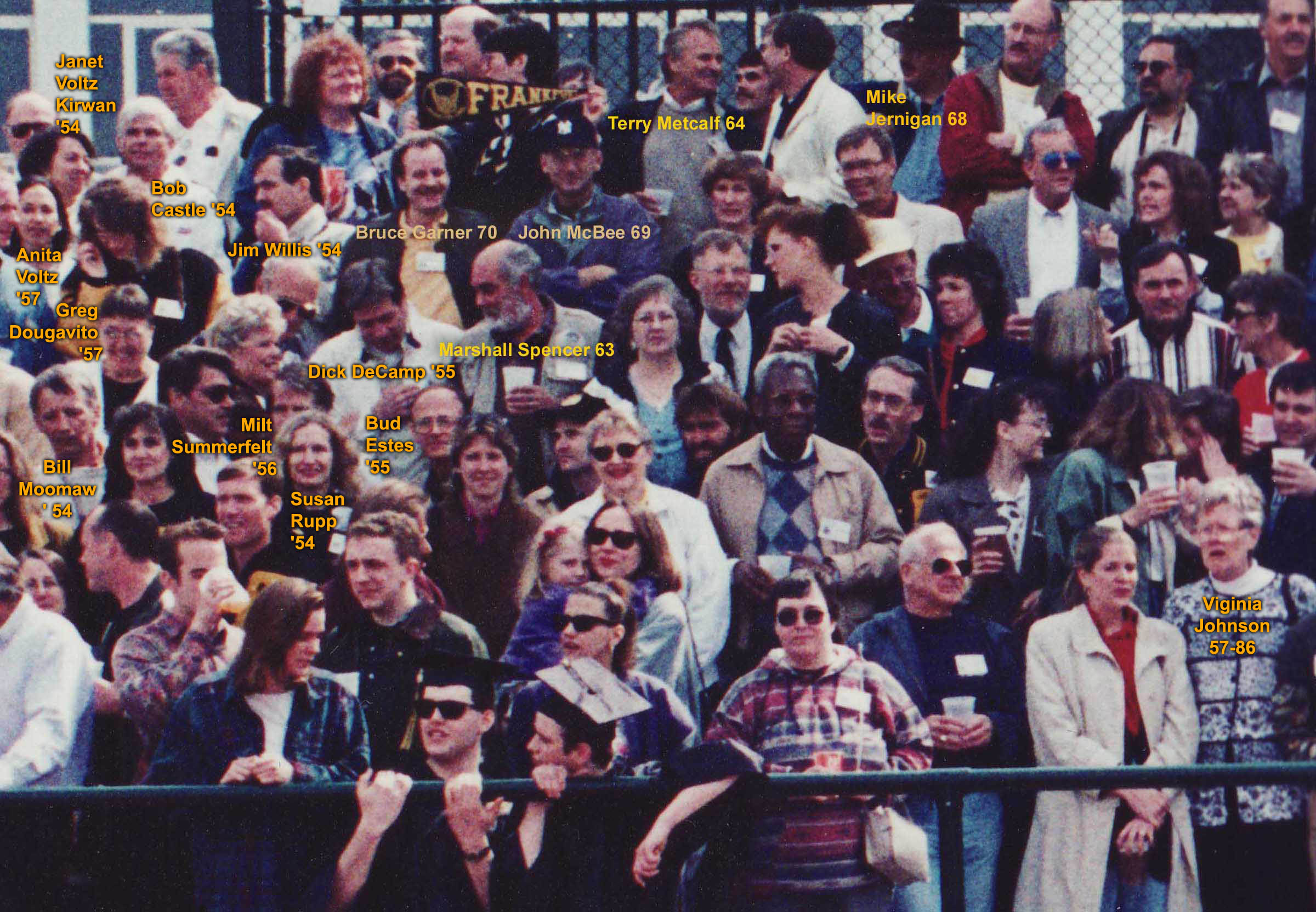 John McBee 69 Bruce Garner 70 Marshall Spencer 63 Terry Metcalf 64 Mike Jernigan 68 Jim Willis '54. Bob Castle '54 Janet Voltz Kirwan '54 Anita Volz '57 Milt Summerfelt '56 Greg Dougavito '57 Bill Moomaw ' 54 Dick DeCamp '55 Susan Rupp '54, Bud Estes '55 |