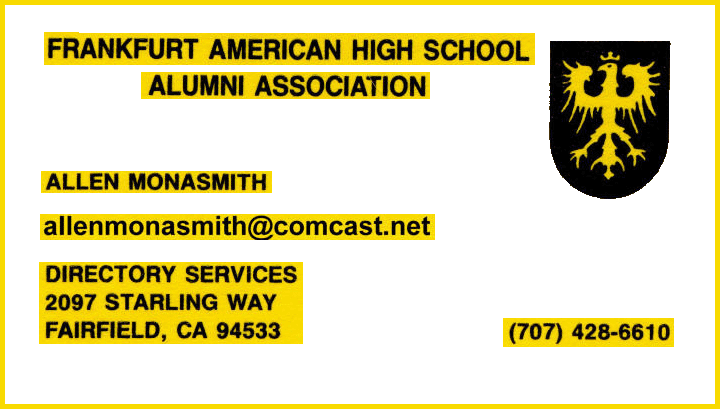 The original Frankfurt American High School Alumni Association was organized in 1983, and covers the Classes of 1954 through 1963. Their logo is (at right) - Allen |