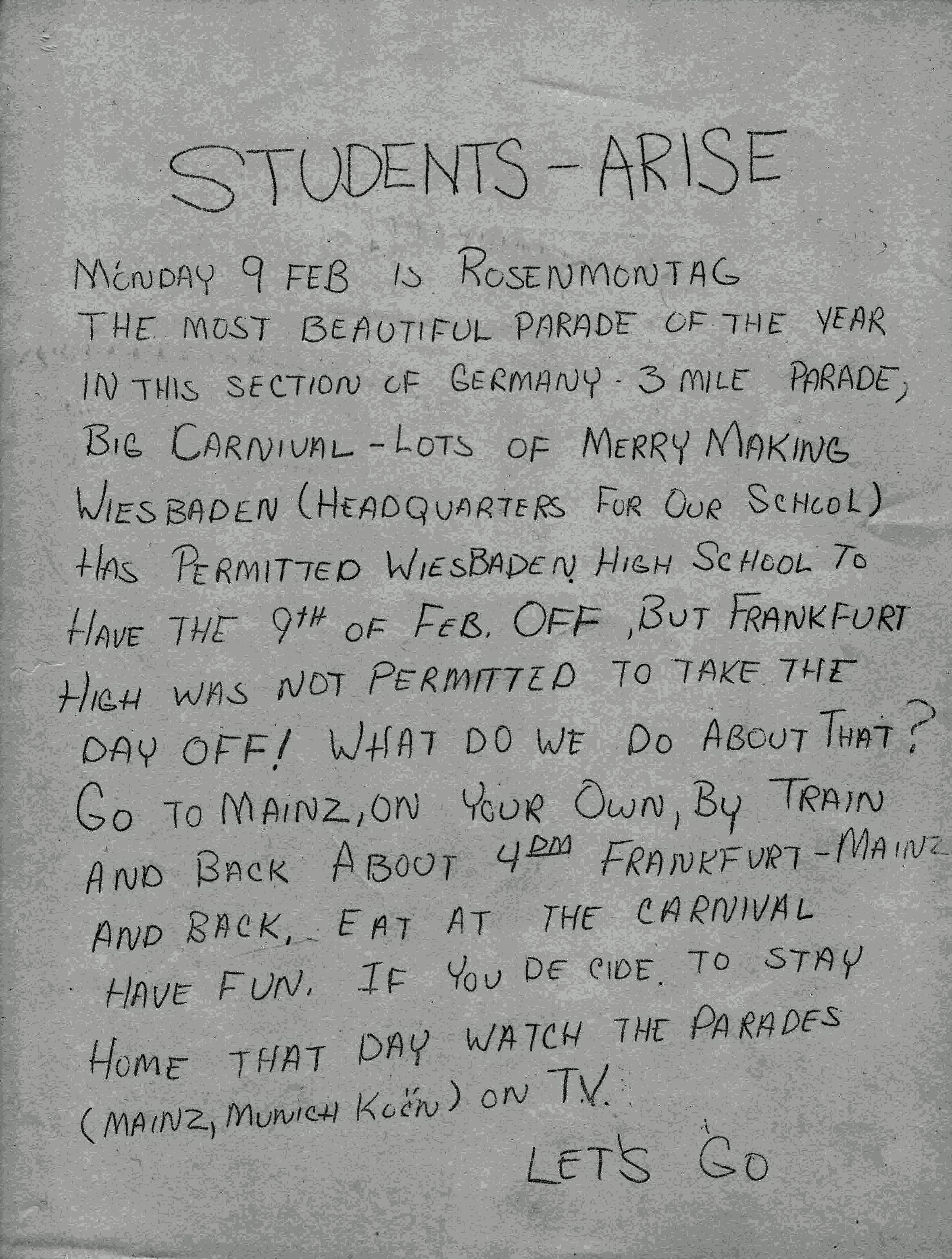 Rosenmontag School Holiday 2/9/70 http://en.wikipedia.org/wiki/Rosenmontag http://www.germanwordsexplained.com/blog/index.php/karneval/rosenmontag/ http://no.myspace.com/index.cfm?fuseaction=vids.individual&videoid=14292201 http://www.mainzer-fastnacht.de/zug2000.htm Images from John Conner / Dutch Meeker comment on Facebook here |