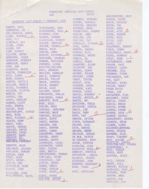 | Kathy Cantu King I see my sister, Ramona and my name on this list. I can't read what is on top, but what is this list for? We both skipped school with a bunch of other Rhein/Mainers and took the train to Mainz. One of the best memories of our time in Germany!!! |