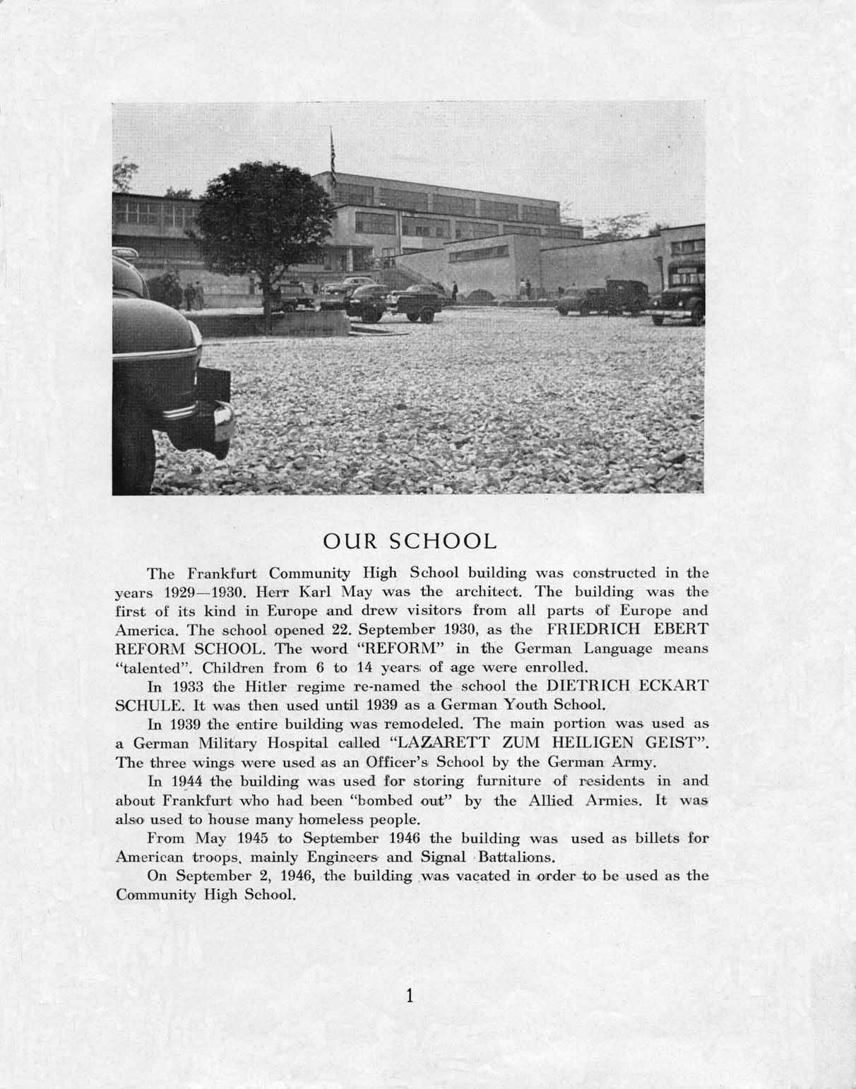 ![]() Before WW2, before it was the first FAHS (46-54) Der Frankfurter Reformschulversuch 1930 – 1937 © Institut für Stadtgeschichte Die Friedrich-Ebert-Reformschule am Bornheimer Hang http://www.ffmhist.de/ffm33-45/portal01/portal01.php?ziel=t_ak_reformschulversuch_02 |